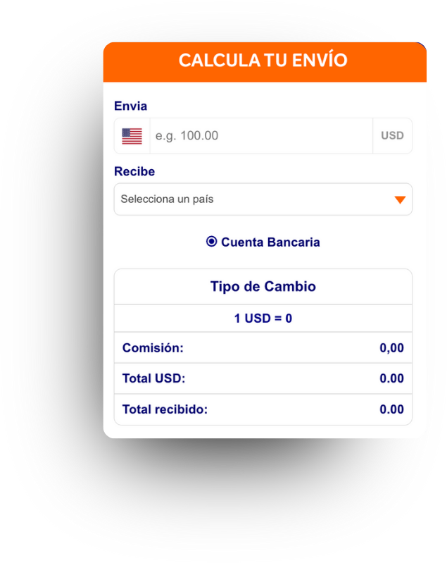 Simplificamos el envío de tus transferencias a múltiples países, incluyendo EE. UU., Canadá, Reino Unido (UK), la Unión Europea (UE), Australia, y más de 15 destinos en Latinoamérica y el Caribe (Argentina, Brasil, México, Colombia, Chile, Perú, Ecuador, Bolivia, Uruguay, Paraguay, Costa Rica, Panamá, República Dominicana, Haití), de manera sencilla y rápida.